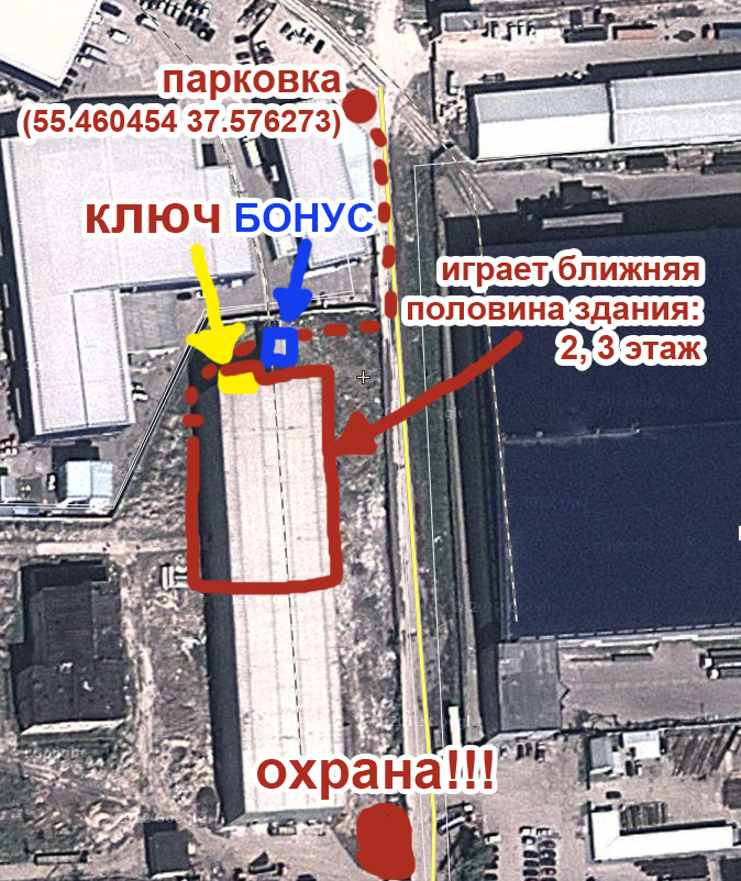 Заходить строго по схеме. До попадания на локацию фонарями не светить. Находясь на локации не шуметь. Играет ближняя к заходу половина здания, отмеченная на схеме. Части находятся на 2 и 3 этажах, ключ находится на крыше, для его взятия необходимо подняться по лестнице с внешней стороны здания. Бонусный код находится на металлоконструкции с крышей (с торца здания). Первый этаж не играет!!!! ПРИМЕЧАНИЕ: КО - 1, 2, 2, 2, 1. КО (bonus) - 3. Составной нестандартный код (5 частей + ключ) На локации есть бонусный код дающий 5 мин. бонусного времени НА ЛОКАЦИИ НИЧЕГО НЕ КРУТИТЬ И НЕ ЛОМАТЬ!
