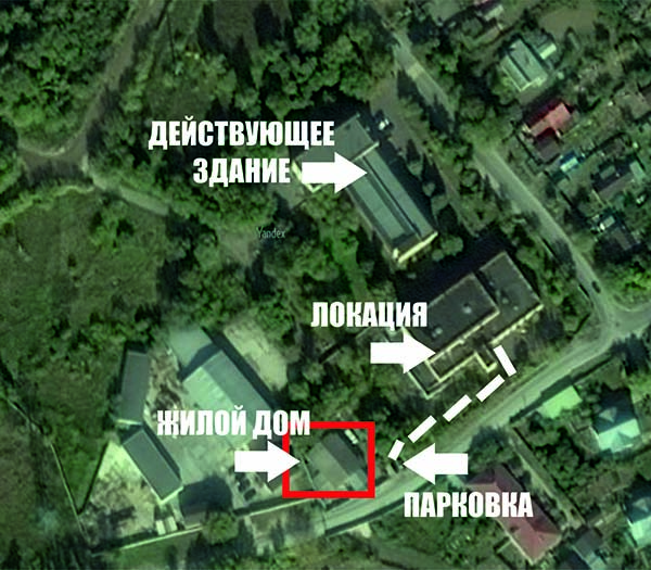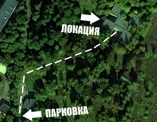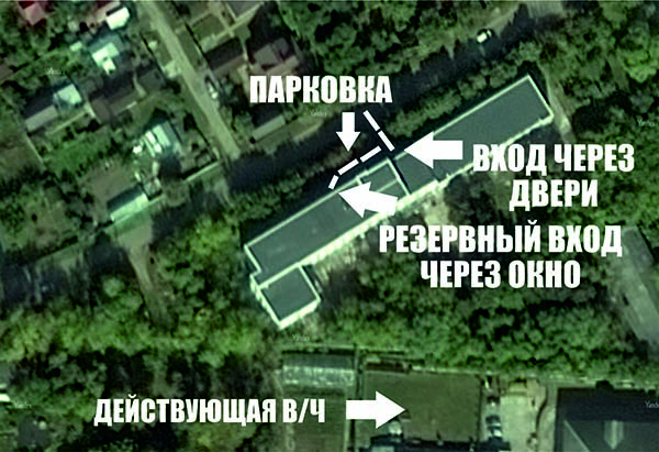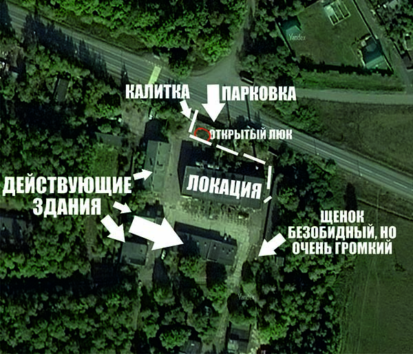 Двигайтесь по координатам: 55.222802, 37.664545 - поворот в лес (малозаметный). Данный въезд закрыт шлагбаумом. Вам необходимо нажать на шлагбаум и опустить его вниз. При этом запорная балка выйдет из под цепей, которые удерживают запорную балку в закрытом положении и она поднимется, тем самым освободив вам проезд. После того, как вы проедете внутрь, закройте шлагбаум аналогичным способом. * закрывать шлагбаум важно, так как по этой дороге регулярно курсируют военные из действующей в/ч. Для них ваше проникновение должно оставаться незамеченным. Далее следуйте до небольшой парковки с заброшенным КПП (слева от дороги). 55.219160, 37.664427 - КПП. Ворота просто закрыты на деревянную палку. Выньте её из пазов и проезжайте на территорию в/ч. Ворота необходимо за собой закрыть. Причина аналогичная ситуации со шлагбаумом. Далее используйте схему движения: